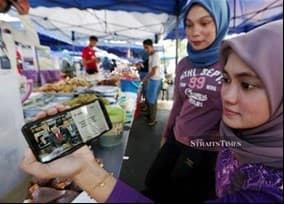 Traders Illiyana Salmi Sulaiman (right) and Nor Syafiqah Sulaiman watch the live telecast of the 2020 Budget in Kuantan market. - NSTP/Farizul Hafiz Awang