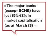 We continue to underweight the banks. The major banks (except BCHB) have lost 15%-18% in market capitalisation (as at March 13) since we downgraded our call on the banking sector from "neutral" on March 4, on rising NPL concerns and expectations of more negative economic newsflow.