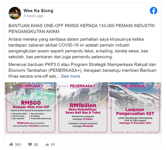 Dr Wee also said the RM1bil allocation for the Bus and Taxi Hire Purchase Rehabilitation Scheme will benefit eligible bus and taxi operators to get a loan moratorium of up to 12 months and an extended period of up to 36 months.