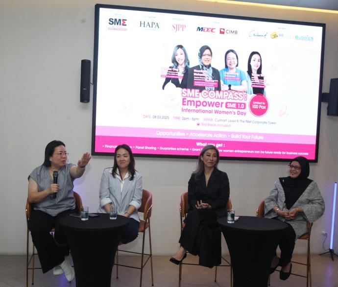 4名主讲人讲解融资和资助计划,助力女性企业家应对未来商业环境。左起为冯翠玲、陈惠盈、王秀萍及诺茜哈