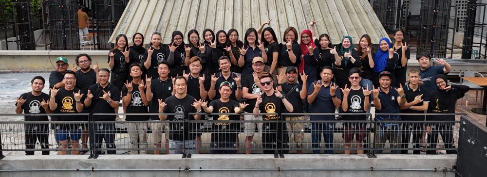 TERUS BERKEMBANG: Melvin (barisan depan, kiri) bersama kakitangan Moonman Events Sdn Bhd merakamkan kenangan.