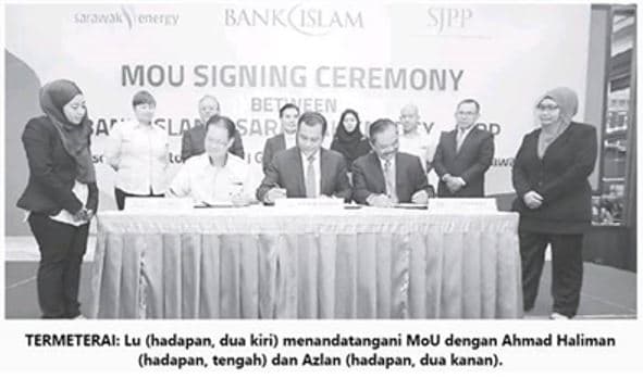 Ketua Pegawai Operasi Kumpulan Lu Yew Hung menandatangani MoU bagi pihak Sarawak Energy manakala Bank Islam diwakili Ketua Perbankan Komersil Ahmad Haliman Abdul Halim. SJPP pula diwakili Pengurus Besarnya Azlan Mohd Agel.