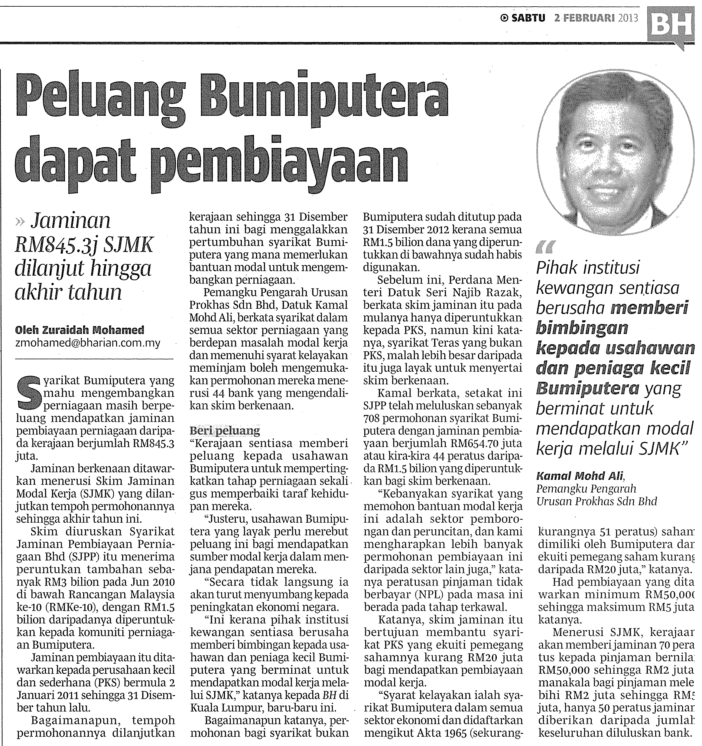 KUALA LUMPUR, 19 Mac (Bernama) - Syarikat Jaminan Pembiayaan Perniagaan (SJPP), setakat 28 Feb, telah meluluskan jaminan pembiayaan bernilai sehingga RM669.91 juta di bawah Skim Jaminan Modal Kerja Rancangan Malaysia ke-10 (WCGS RMK10) untuk 718 syarikat Bumiputera dari pelbagai sektor bagi mengembangkan dan memajukan perniagaan mereka.